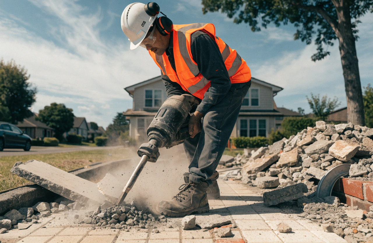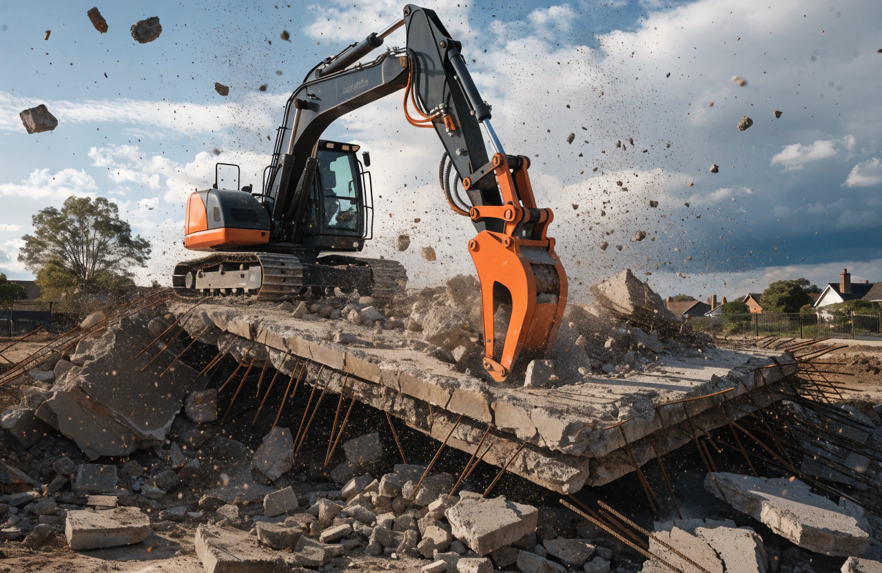 For standard residential slabs and driveways, electric and pneumatic jackhammers handle the breaking work quickly and with precision. Thicker slabs, reinforced concrete, and larger commercial surfaces call for rock breakers and excavator-mounted hydraulic hammers — which break through heavily reinforced concrete far faster and with significantly less physical risk than hand-held equipment alone.
